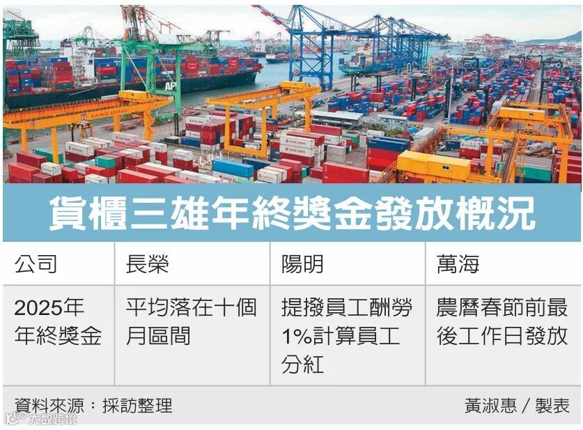 阳明海运和万海航运2025年获利有望创下史上第四高佳绩,员工对年终奖金满怀期待。