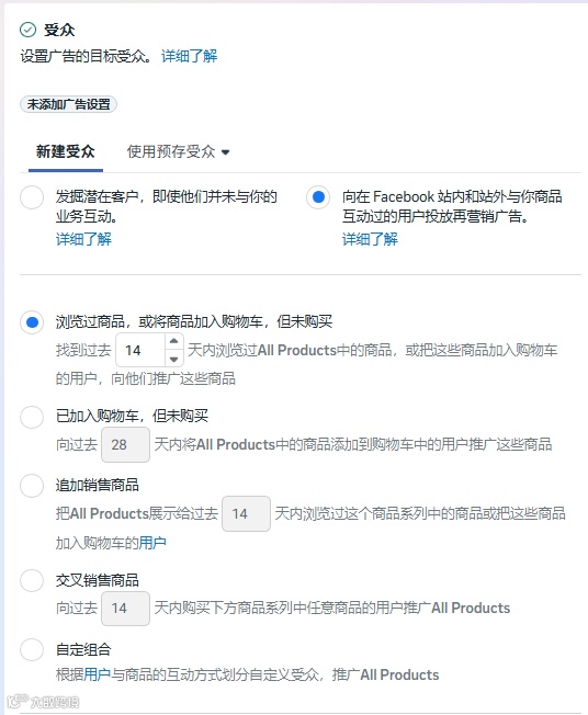 选受众,这里的受众可以选发掘新客或者抓老客,可以根据实际业务情况选择,如果网站流量比较大,可以优先选择浏览过的商品或者已加购未购买,时间选小点,如7天内,广告层的设置跟常规广告设置差不多,只不过文案,你需要针对复购或者浏览/加购未购买调整下。