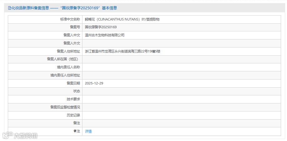12月29日,国家药监局化妆品新原料备案信息显示,温州古木生物科技有限公司(以下简称“古木生物”)已完成对鳄嘴花(CLINACANTHUS NUTANS)叶/茎提取物的新原料备案,备案号为“国妆原备字20250169”。目前相关技术要求尚未公示。