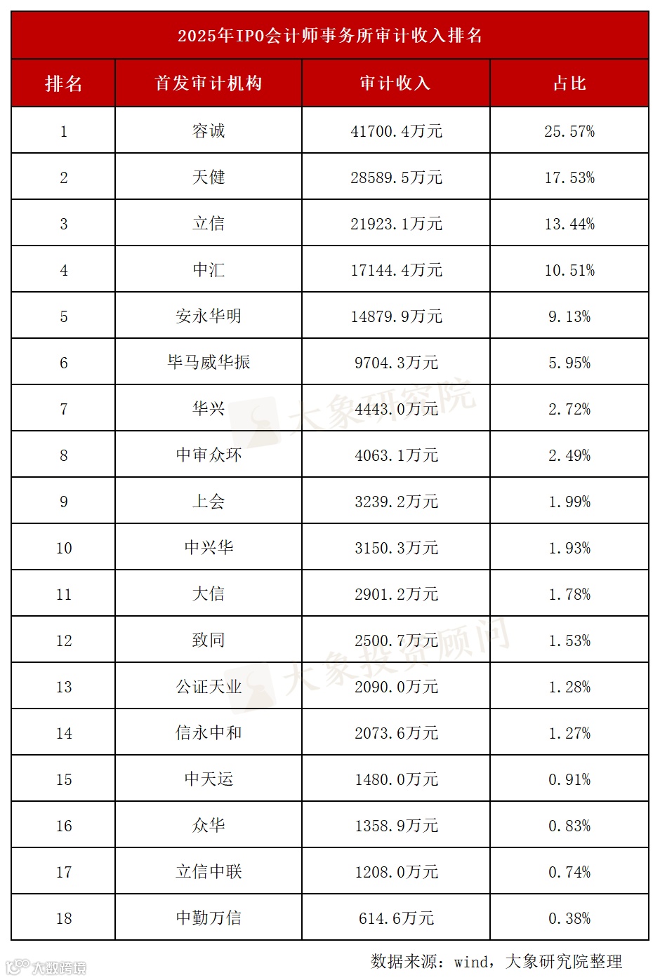2025年1-12月,共有18家会计师事务所担任IPO审计机构。容诚以4.17亿元审计收入居首;天健以2.86亿元位居第二;立信以2.19亿元排名第三。