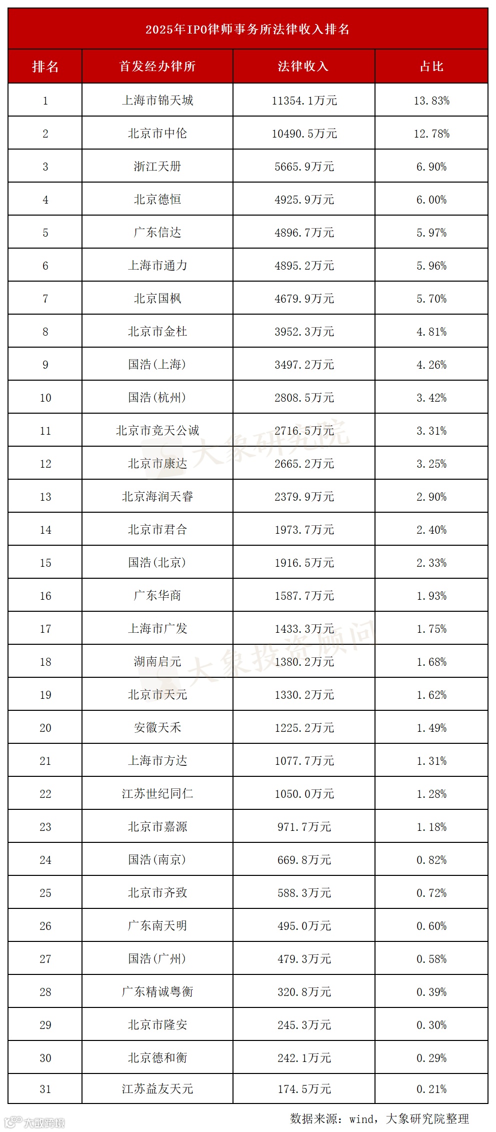 2025年1-12月,共有31家律师事务所为IPO企业提供法律服务。锦天城以1.14亿元法律服务收入排名第一;中伦以1.05亿元位居第二;天册以5665.9万元排名第三。