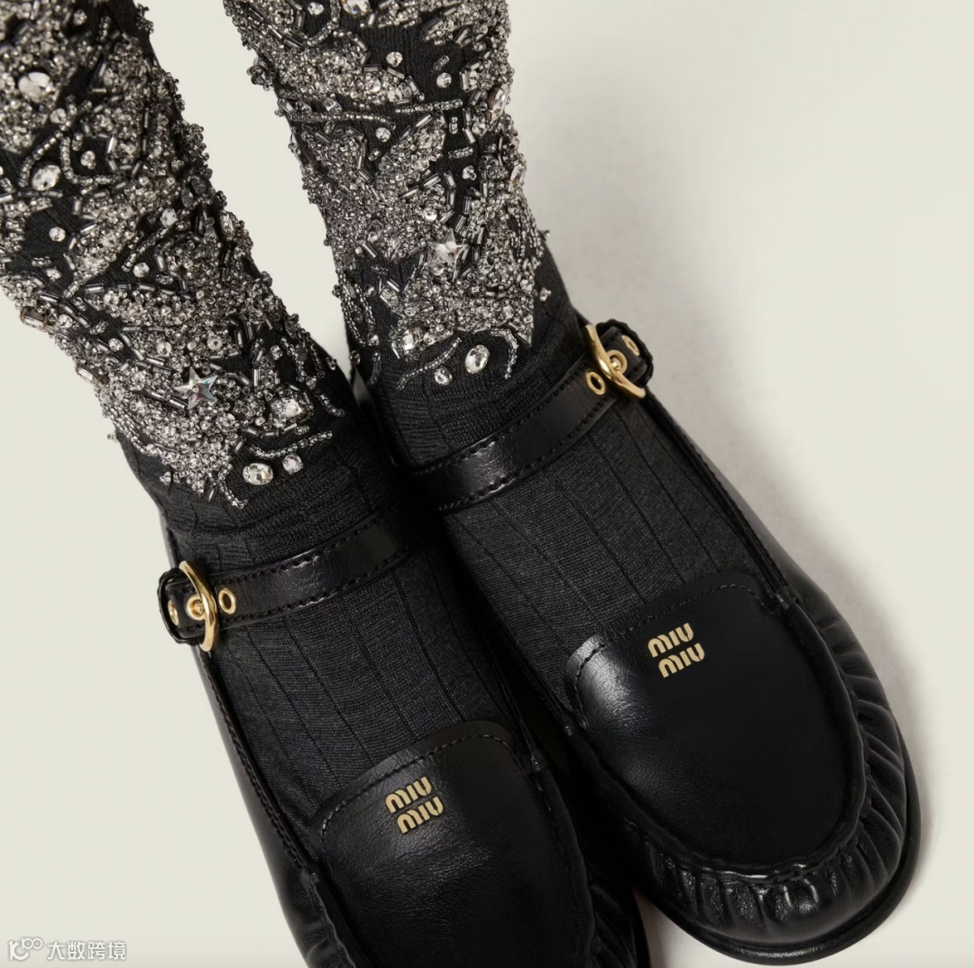 Miu Miu推出新款搭扣皮革乐福鞋,重新定义传统比例。鞋面止于前足附近,相较常规乐福鞋更显紧凑精致,通过细微比例调整营造更具时髦感的视觉效果,融合玛丽珍元素,打造兼具优雅与个性的鞋履新作。