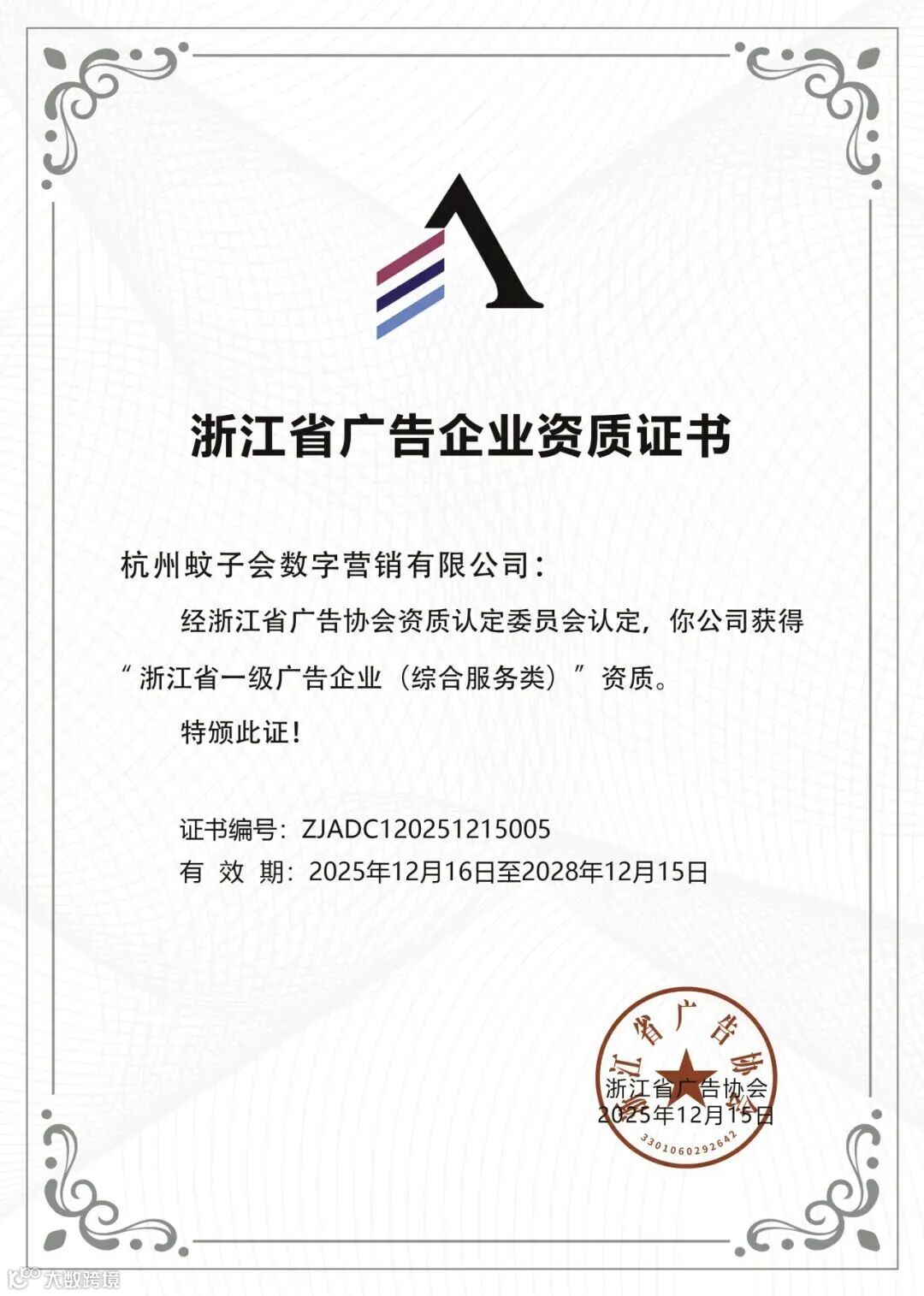 近日,蚊子会正式获得“浙江省一级广告企业(综合服务类)”资质。这是继公司取得中国广告协会“CNAAⅠ(一级广告企业)”认证后,在省级权威评定中再获重要认可,标志着蚊子会在专业能力、经营规模、服务水准及行业贡献等方面已稳居浙江省广告行业第一梯队。