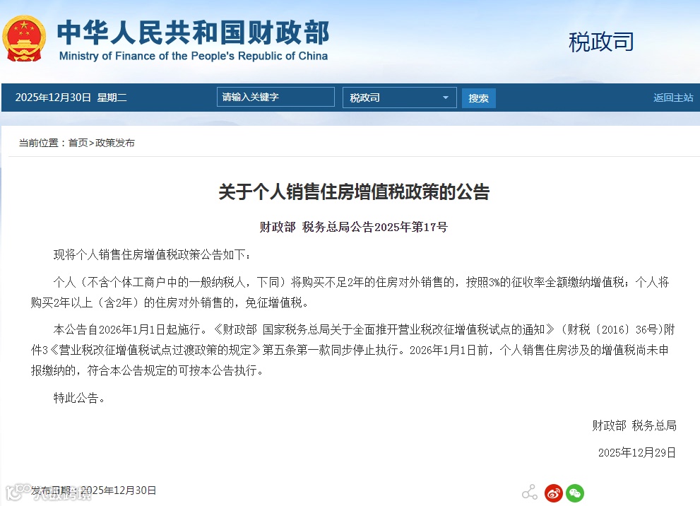 本公告自2026年1月1日起施行。《财政部 国家税务总局关于全面推开营业税改征增值税试点的通知》(财税〔2016〕36号)附件3第五条第一款同时废止。2026年1月1日前未申报缴纳的个人住房销售增值税,符合新规条件的,可按本公告执行。