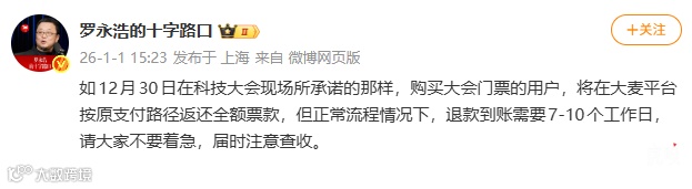 罗永浩1月1日微博确认,“科技春晚”因技术故障导致延迟开场,已按承诺在大麦平台原路全额退款,预计7–10个工作日到账 [11] 。