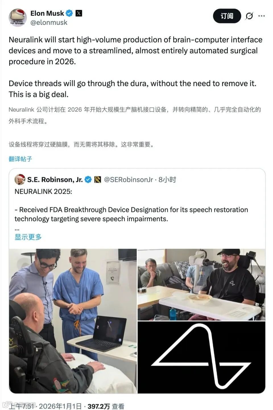 1月1日,马斯克宣布Neuralink将于2026年开始大规模生产脑机接口设备,并转向精简、高度自动化的手术流程 [5] 。