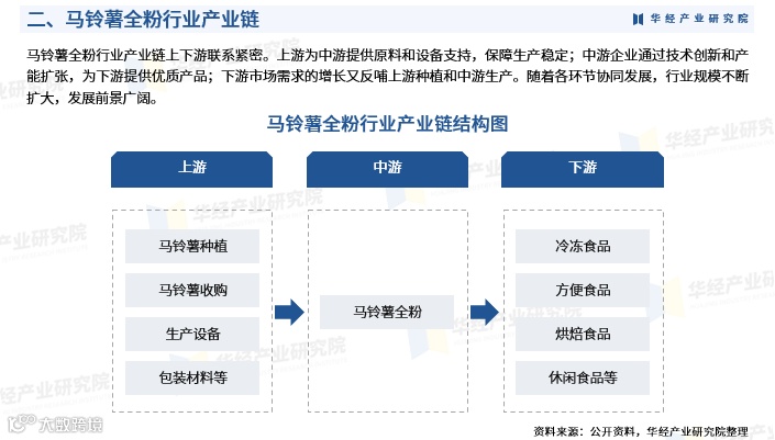 马铃薯全粉行业上下游联系紧密:上游提供原料与设备保障中游生产;中游企业通过技术创新和产能扩张提升产品供给能力;下游需求增长反向推动种植与加工环节发展。各环节协同推进,促进行业规模持续扩大。