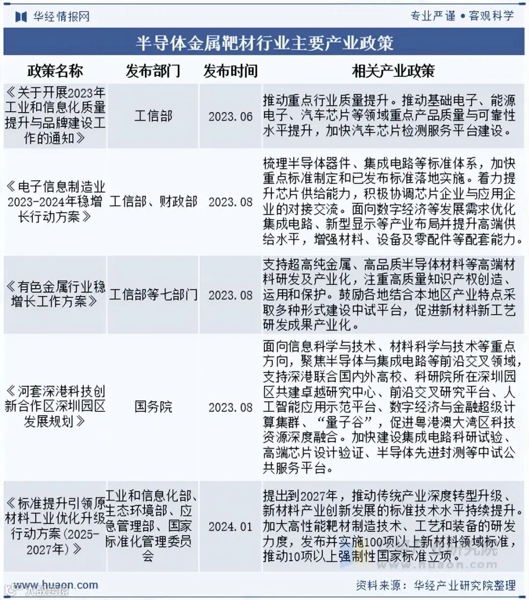 近年来,中国政府持续出台支持政策推动半导体材料产业发展。《标准提升引领原材料工业优化升级行动方案(2025-2027年)》明确提出,到2027年将全面提升新材料领域的标准技术水平,重点加强高性能靶材制造技术、工艺及装备的研发,计划发布实施100项以上新材料相关标准,并推动10项以上强制性国家标准立项,助力产业转型升级。