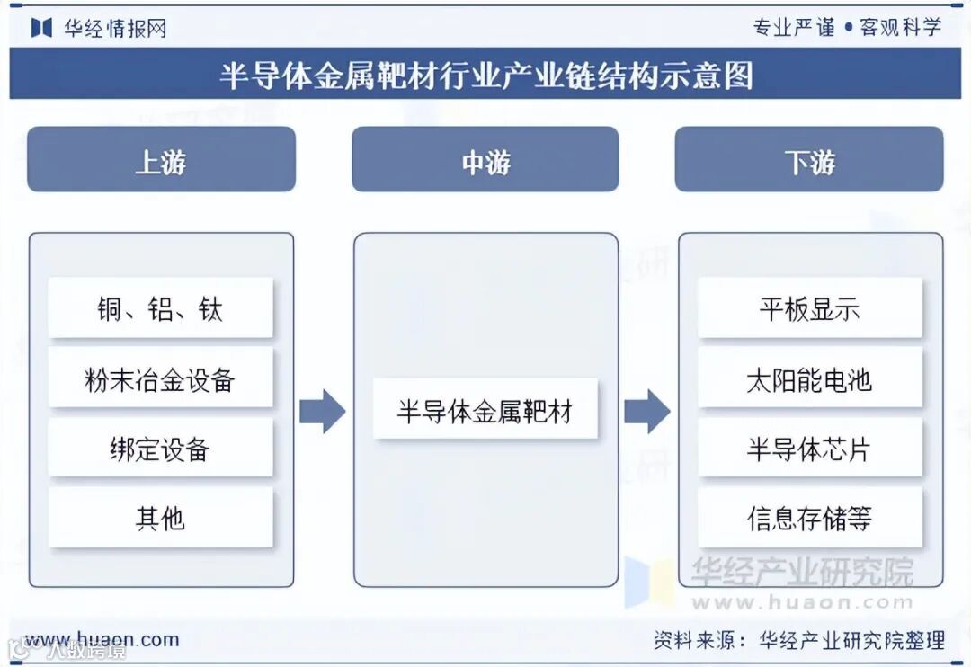 半导体金属靶材产业链属于技术密集型体系,上游为高纯金属原料和生产设备供应,直接影响中游靶材产品的品质与成本;下游则主要面向半导体制造行业,其技术演进和市场需求变化驱动靶材产品持续创新升级。