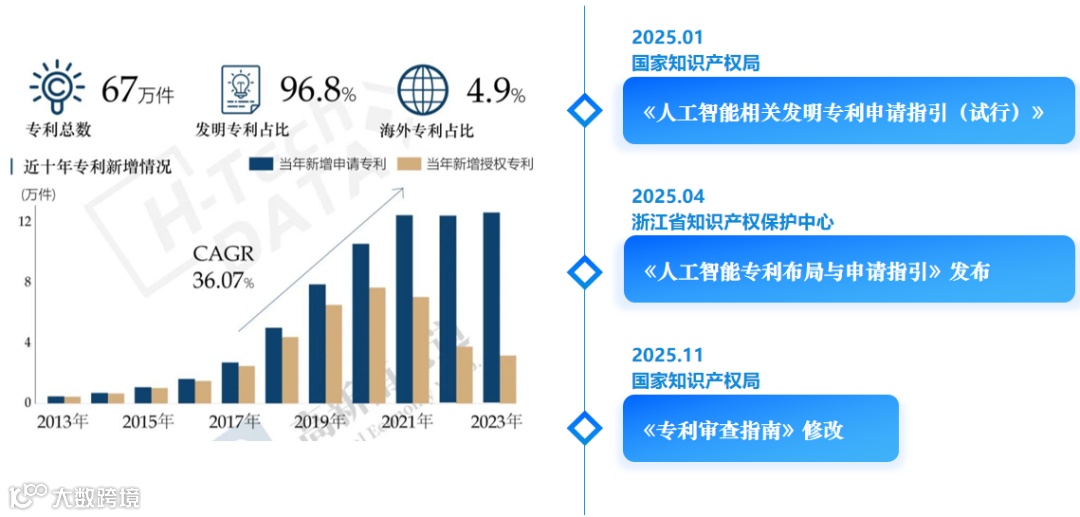 我国AI专利申请量年均复合增长率超36%,全球超60%的AI专利申请来自中国。国家知识产权局近期大幅修订《专利审查指南》,新增人工智能与大数据专章,明确细化审查标准,旨在提升申请质量、规范创新成果保护路径 [5] 。