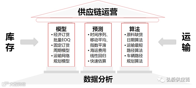 数据分析是基础支撑,供应链运营为顶层目标,模型、预测与算法构成三大支柱,整体内容紧扣库存与运输两大主线。