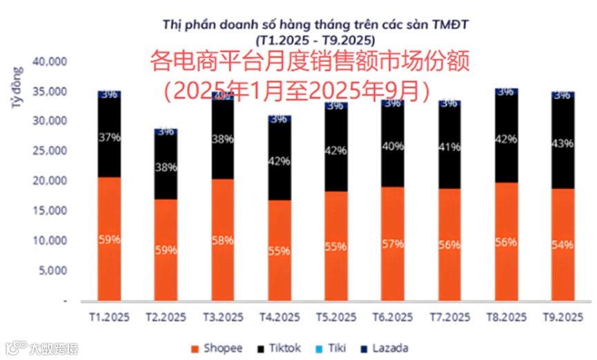 尤其在第三季度,TikTok Shop销售额同比暴涨69%,市场份额升至41%,逼近Shopee的56%。剩余约3%由Lazada及本土平台Tiki等瓜分。