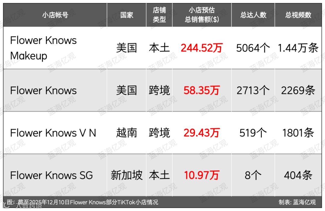 高曝光带来高效转化。截至2025年12月10日,花知晓在美、东南亚等地TikTok小店合计预估销售额达343万美元,其中美国账号(Flower Knows Makeup)贡献244.52万美元,关联达人5064位,视频1.44万条。
