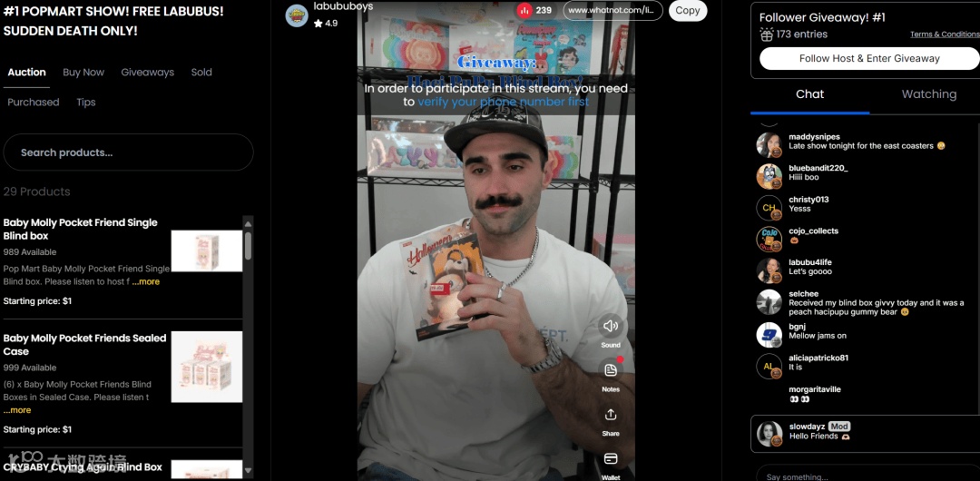 用户的狂热是平台增长最坚实的底座。数据显示,Whatnot的用户日均使用时长高达80分钟,比TikTok的52分钟多出了近半小时。这种超强的用户粘性,源于其独特的互动模式——购物在这里不再是被动的浏览,而是一场场充满未知和竞争的游戏。