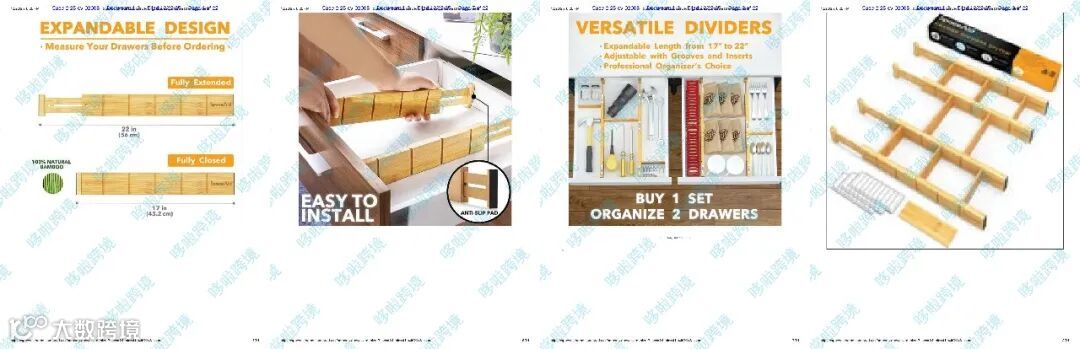 SpaceAid 可调节抽屉分隔板(如 4 个分隔板搭配 9 个隔板,可个性化组合)、BottleOrganizer 瓶子收纳架等,主打实用、环保、美观的收纳解决方案。其外观专利覆盖产品的整体设计、面板结构等,未经授权复制、销售、许诺销售等行为均可能构成侵权。