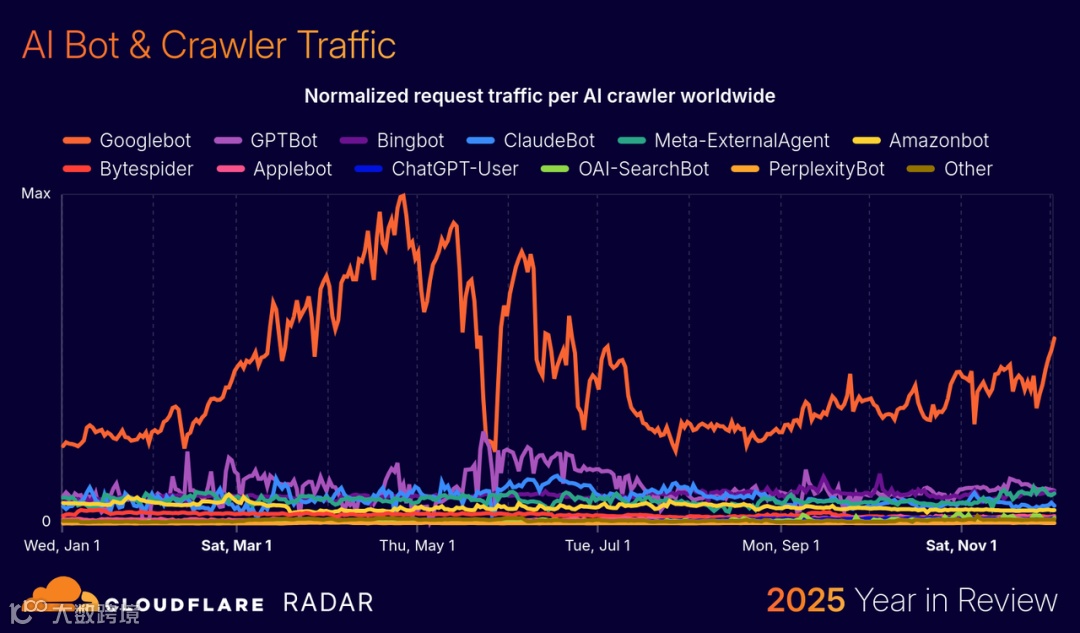 商Cloudflare近期发布《2025年度回顾报告》,从全球基础设施视角揭示生成式AI对互联网流量结构与网站运营的深层影响。