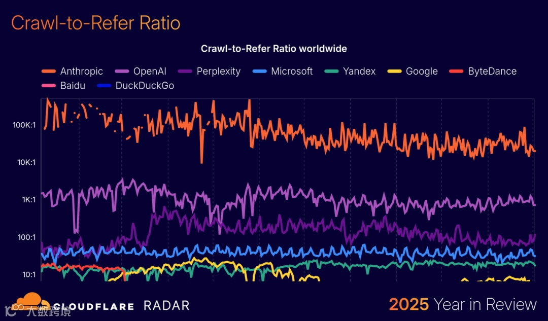 Anthropic爬行推荐比率曾达500,000:1,目前稳定于25,000:1–100,000:1区间;OpenAI峰值为3,700:1,后续随ChatGPT搜索功能上线有所改善。