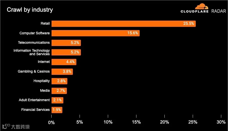 Googlebot强势主因在于双重任务:既为搜索引擎建索引,亦承担Google大模型训练数据采集。零售与计算机软件行业成为AI爬虫重点目标,合计吸引超40%爬取流量。