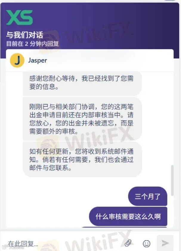 近期,XS平台再次被曝拒不处理出金申请。有用户提交出金已逾三个月,仍处于“审核中”,且账号已被禁止交易。客服回应称:“您的出金并未被遗忘,而是需要额外审核,请放心,我们每日持续跟进。” [2]