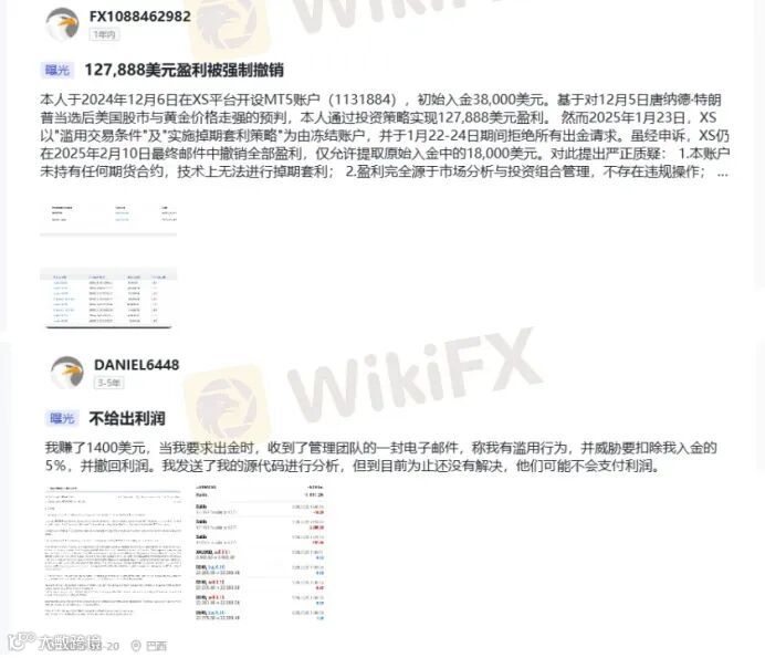 除拖延出金外,“清除利润”亦为高频投诉问题。多位用户在盈利后被XS以“滥用交易条件”为由撤销全部盈利,仅允许提取本金;其中一名用户更被威胁扣减5%本金 [4] 。