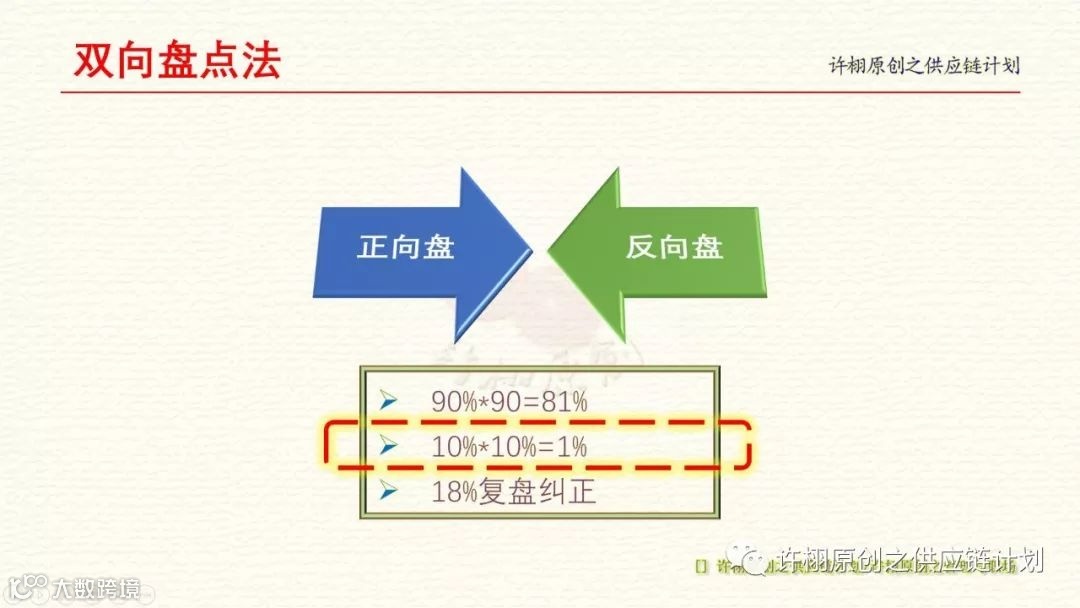 两组人员反向盘点后交叉核对,或单组往返两次盘点。通过结果比对锁定差异区间(如准确率90%时,差错率可由10%降至1%),有效降低漏判率。
