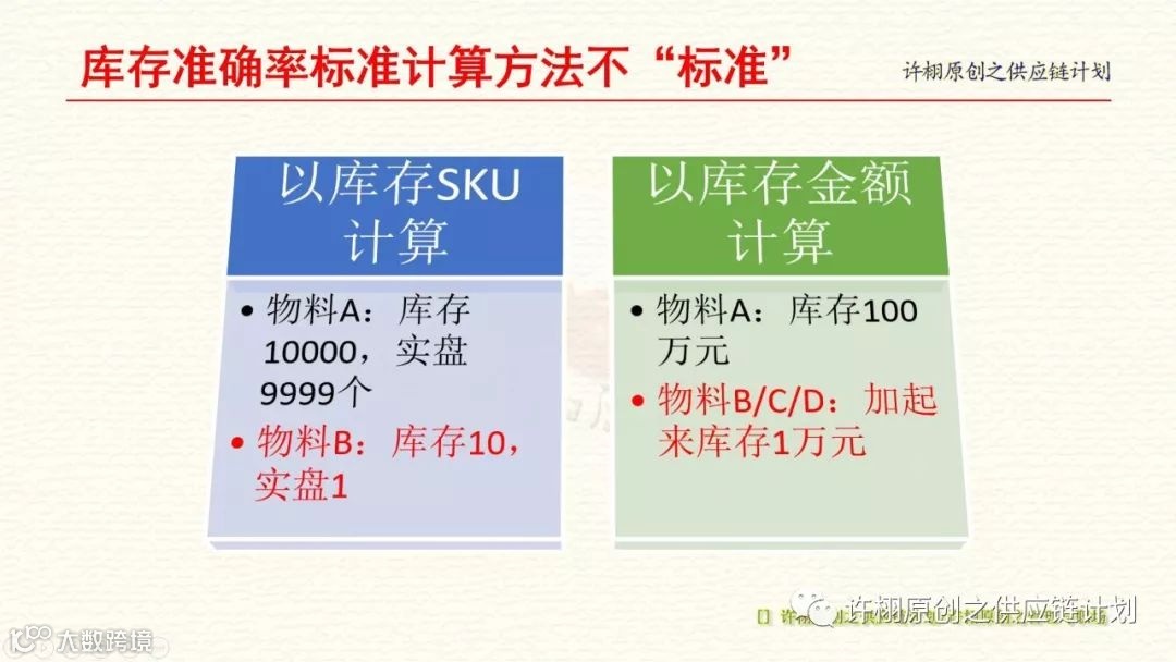 ① SKU法:准确SKU数 ÷ 库存总SKU数; ② 金额法:[库存总金额 − Σ|盈亏金额|]÷ 库存总金额。
