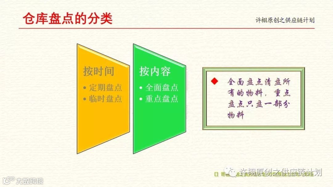 仓库盘点可从时间跨度、盘点内容和盘点作用三个维度进行分类。