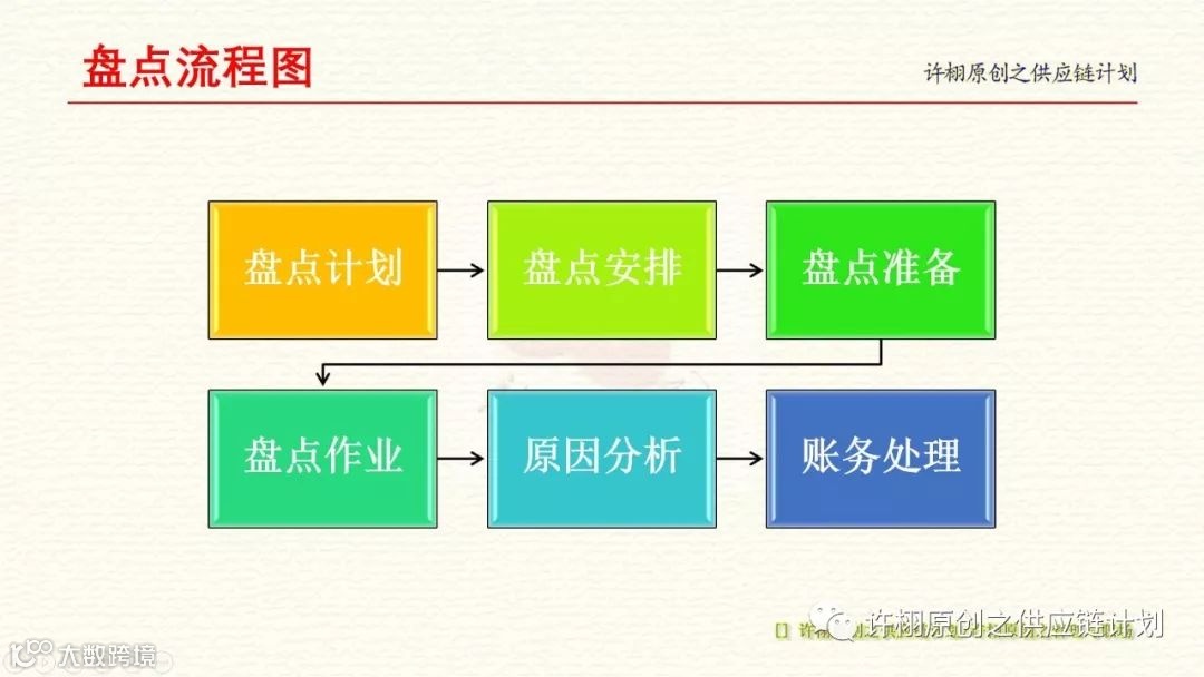 通用盘点流程包含六个关键步骤:盘点计划 → 盘点安排 → 盘点准备 → 盘点作业 → 原因分析 → 账务处理。