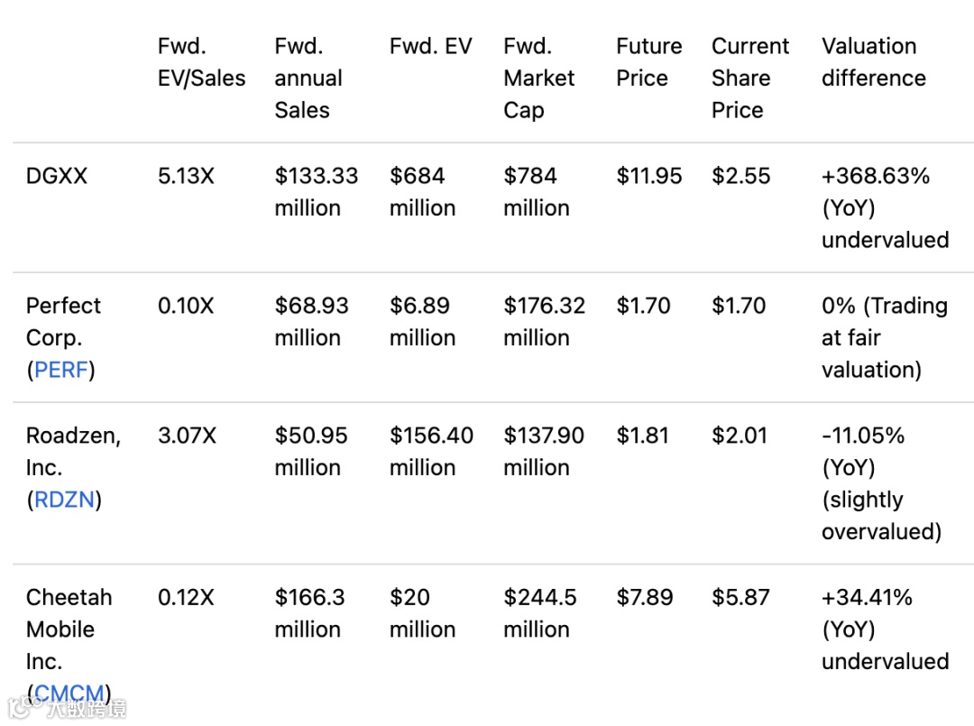 DGXX与CMCM(Cheetah Mobile)同属估值偏低阵营。CMCM受益AI机器人与工具功能升级,2025年前三季度收入同比增长48%,AI业务增长151%;全年收入预计由2024财年7090万美元升至1.663亿美元。PERF处于合理估值区间,RDZN则略高估。