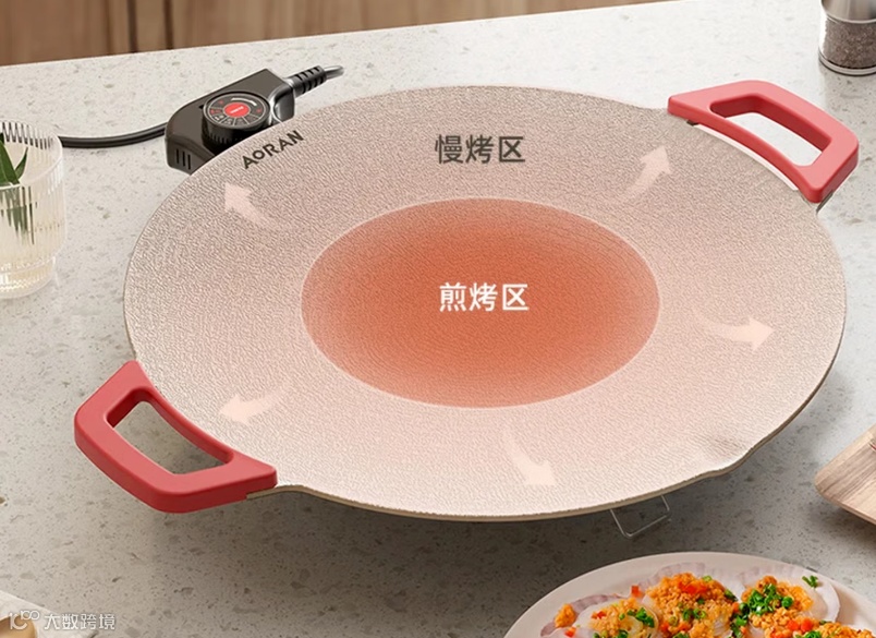 产品采用一体式圆盘造型,直径40cm,集成慢烤区与煎烤区;麦饭石涂层确保受热均匀、轻烟少油、不粘易洁;配备插电控温模块、折叠支架及隔热手柄,即插即用、便携安全。