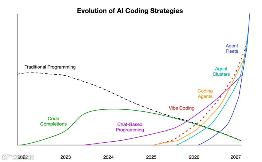 当前仍属“镰刀收割”阶段,明年将迈入“机械化耕作”——大型AI拖拉机(Factoryized Programming)全面替代手工劳作。它正降低编程门槛,使非程序员参与开发成为现实,倒逼企业重构团队规模(理想团队或仅2–3人)、治理结构与反馈闭环。