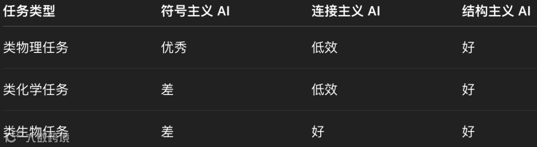 符号模型擅类物理任务,但在类化学与类生物任务上失效;联结主义模型通用性强,却因缺乏结构,在类物理与类化学问题上效率极低。