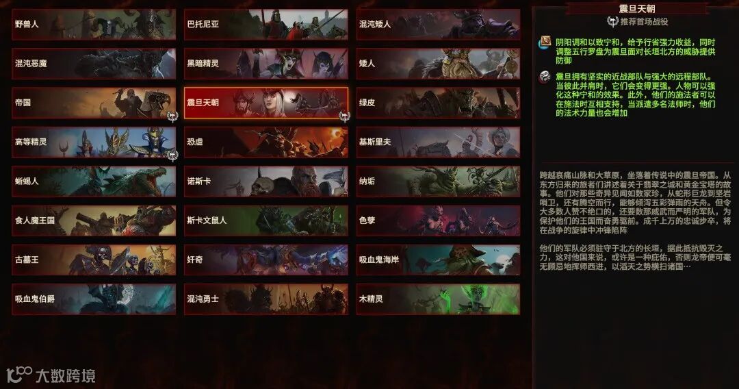 奇幻世界观的另一个好处在于种族林立,派系众多,玩法机制各有特色,经过CA的勤耕不辍,目前大多数派系的可玩性都不错,少有坐牢感。(这里点名批评大地精汗国混沌矮人)如果本身对中古战锤的世界观感兴趣,游玩体验则会更好。