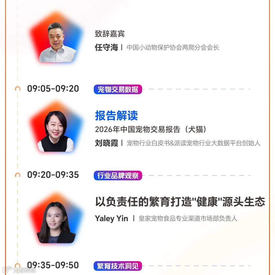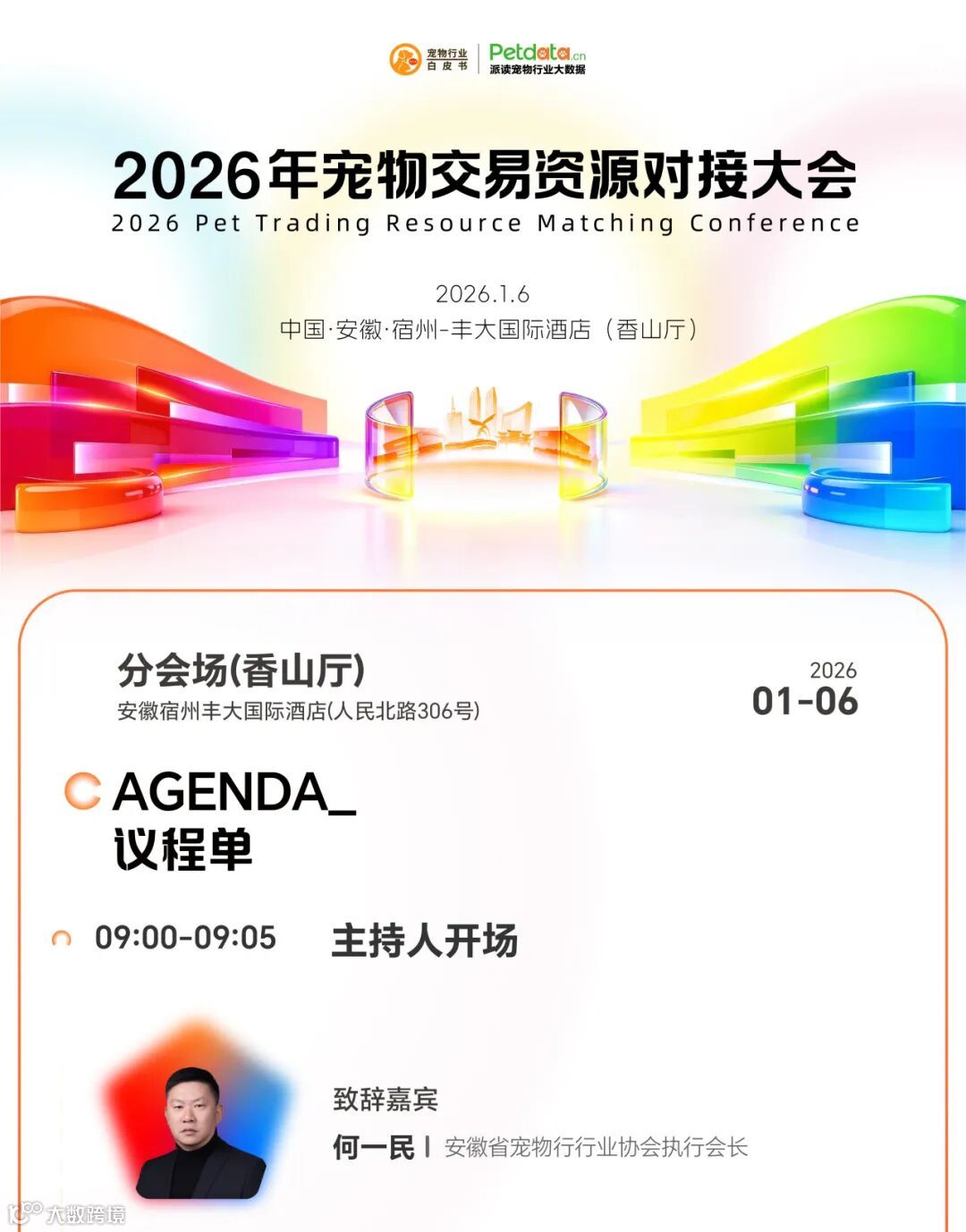 本次大会为期两天,1月5日将举办2026年中国宠物行业数据发布会,1月6日将举办2026年宠物交易资源对接大会。会上将重磅首发《2026年宠物行业白皮书(消费报告)》《2026全球宠物行业白皮书》《2026年中国宠物交易报告(犬猫)》,并联合淘天、京东、抖音、小红书首次实现宠物板块年度数据同台发布。同时,四场深度圆桌对话,将助您破解异宠交易与繁育痛点。除此之外,本次大会还将举办PetAwards派读奖颁奖典礼。目前,大会全议程已公布,详情可查看下方议程图: