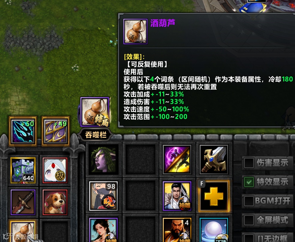 还有一个很有意思的奖励道具就是酒葫芦,这个道具所有的属性加成都是浮动的,每180s一次机会,能刷到什么属性全凭运气,但是大家并不用过于追求极致,四个属性里有两个到距离极致较近的区间就行了。