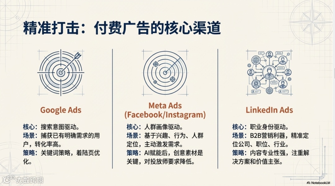 产品创新之外,营销是出海核心挑战。主流方式包括付费广告、