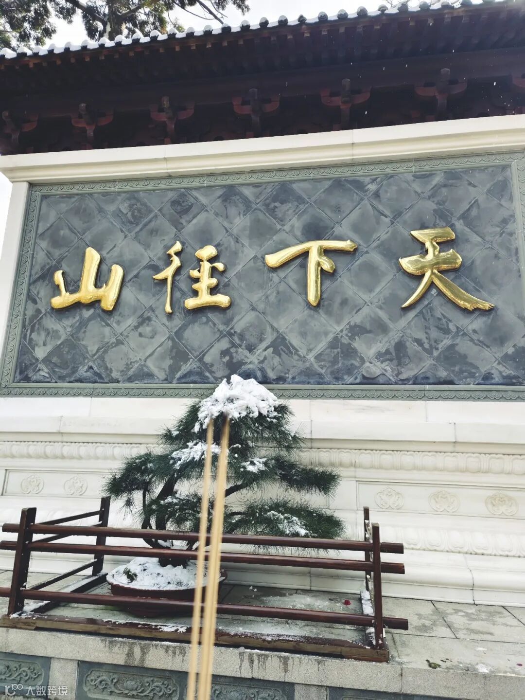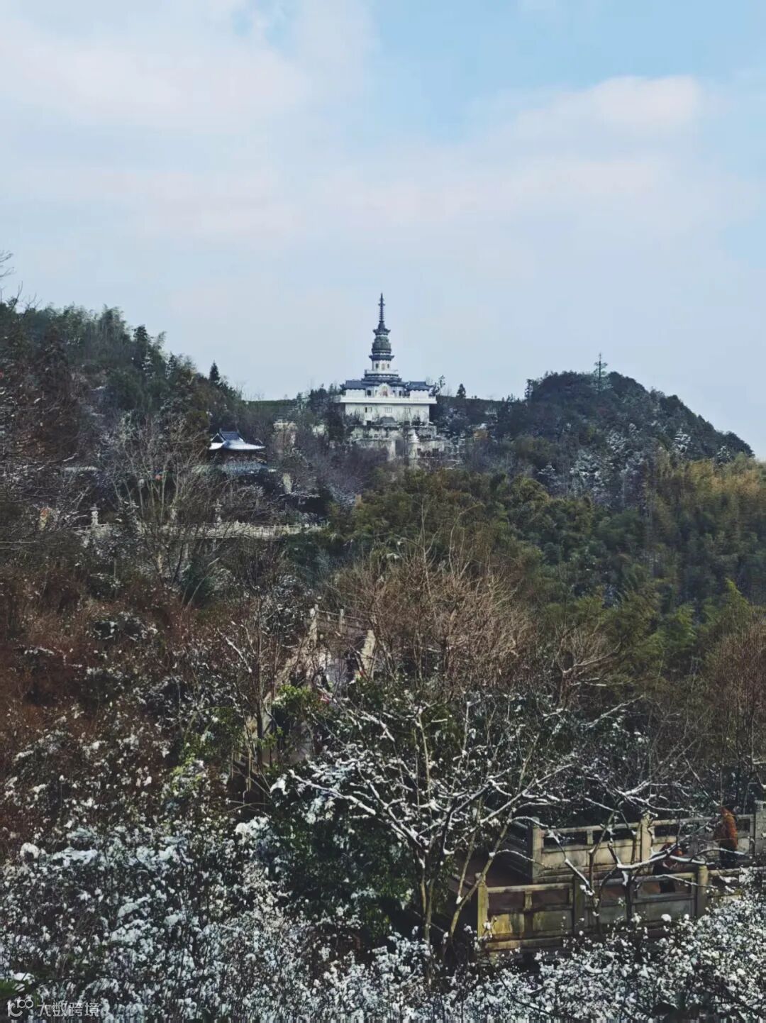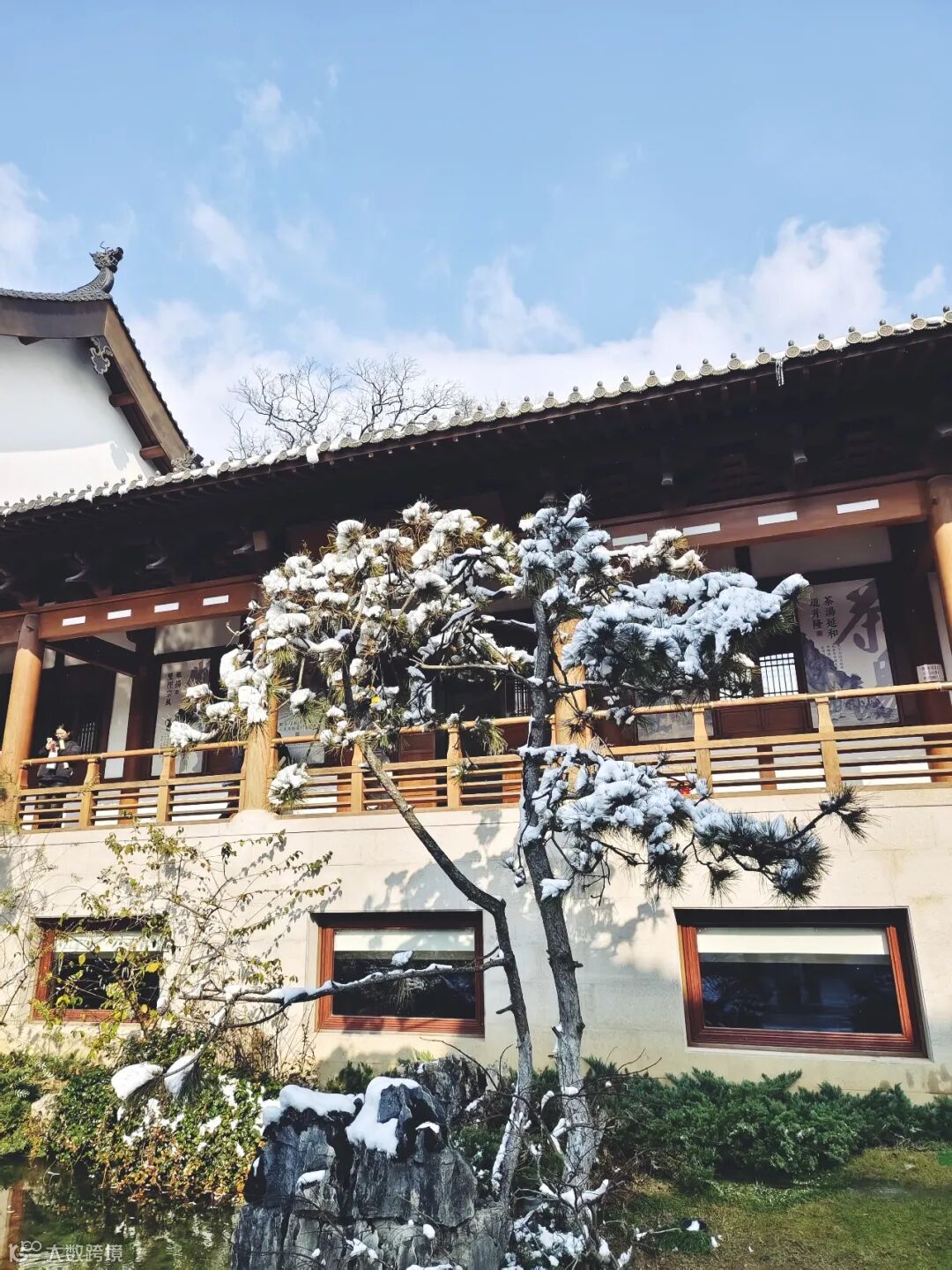 山顶的径山寺,在雪中显出一种收敛而有分寸的精致。檐角、台阶、殿宇比例端方,在素雪映衬下尤显沉稳节制,仿佛每一处构形皆经深思熟虑,无一赘笔。