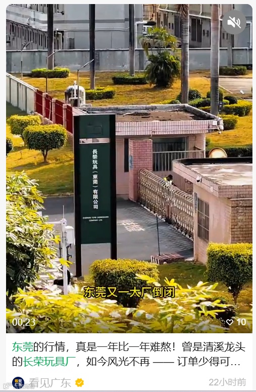 近日,东莞清溪镇知名玩具制造企业——长荣(东莞)玩具厂宣布,自2025年12月23日起实施阶段性停工停产,暂定两个月。