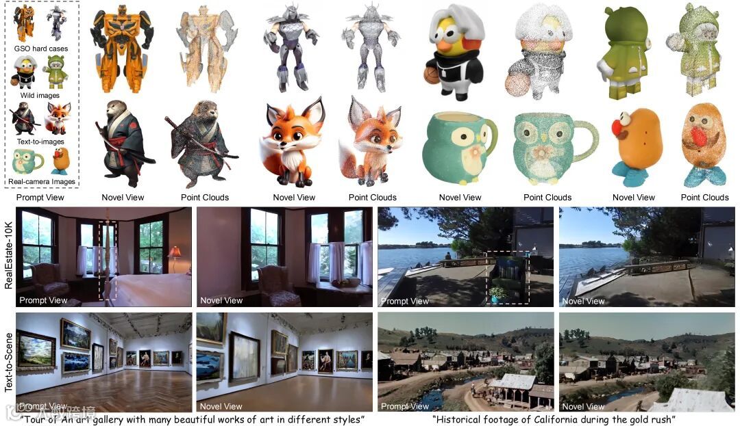 (1) 设计了一种单阶段的 3D 生成框架,名为 DiffusionGS,将 Gaussian Splatting 嵌入到 pixel space 的 Diffusion model 当中,能用于 object-centric 和更大尺度 scene-level 的单视角输入三维重建。值得一提的是,我们的方法在做单视角 scene-level 重建时无需像之前的方法一样需要借助一个单目深度估计器,我们的方法本身就具有深度感知能力。