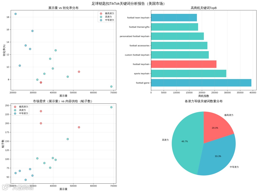 作为核心关键词,“football keychain”(足球钥匙扣)自然不能忽视。展示量52800次,转化率9.25%,潜力等级为“极高潜力”。