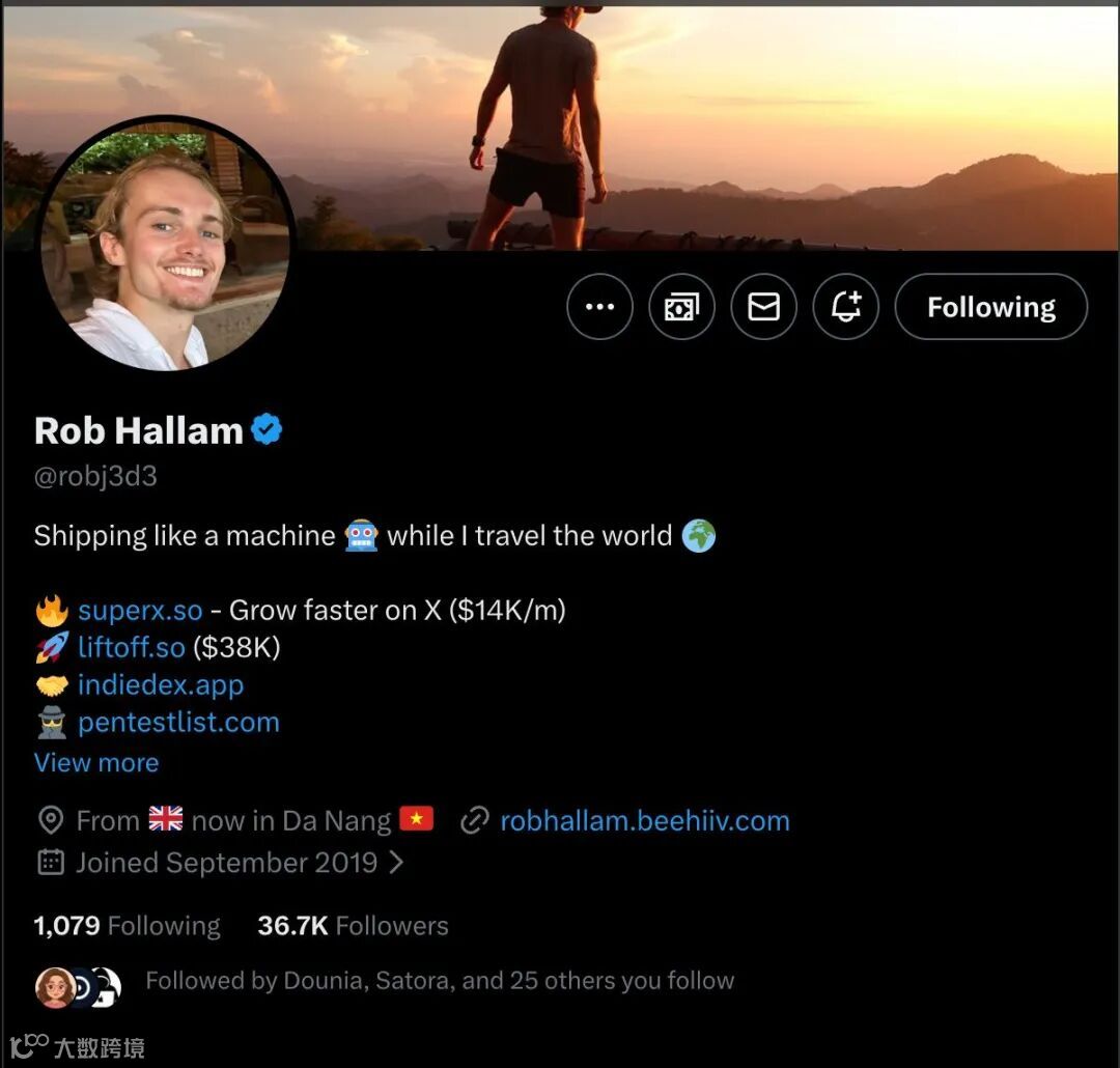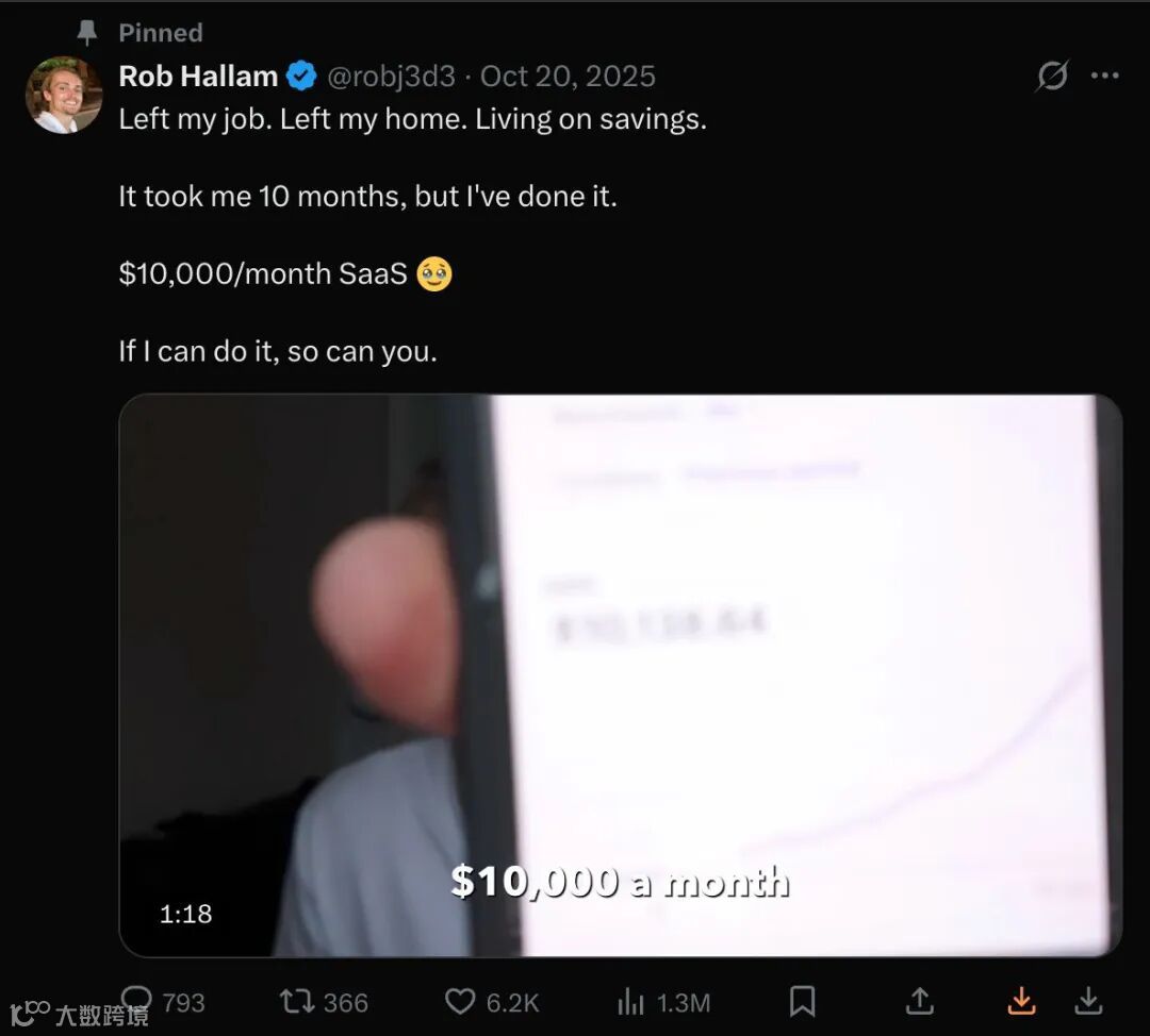 Rob Hallam是一名普通程序员,未投放任何广告,仅靠在X平台持续发布创业过程记录,从0粉丝起步,实现月经常性收入(MRR)达13,000美元。