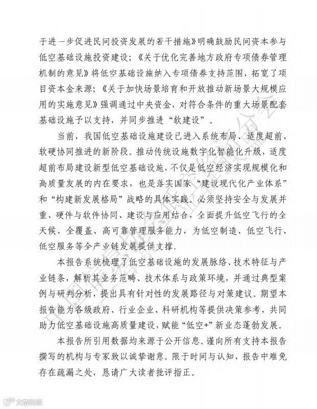 报告立足国家“适度超前建设新型基础设施”战略部署,全面解析低空基础设施的内涵外延,涵盖物理起降设施、能源补给网络、信息通信系统、智能管控平台等全链条环节,旨在为政府规划、企业布局、科研创新提供权威决策参考,推动低空经济成为万亿级现代产业集群,为中国式现代化注入“空中力量”。