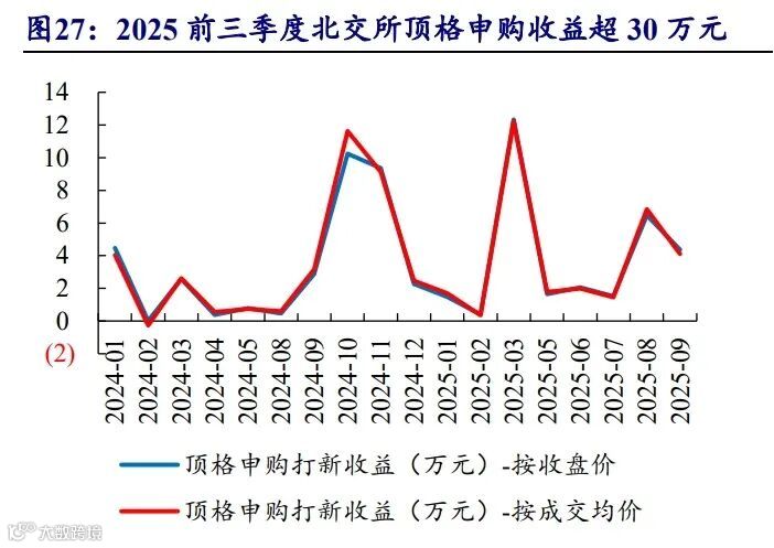 2025年上半年北交所新受理IPO达104家,同比增长3.3倍,创历史同期新高;前三季度累计过会25家,同比增长78.57%。在首日涨幅和顶格申购金额双双提升带动下,网上中签率持续走低,打新赚钱效应显著增强。