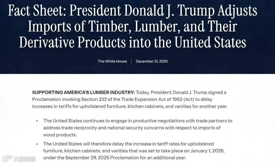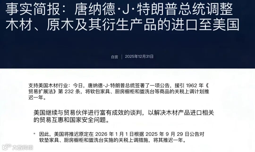 2025年12月31日,白宫发布《特朗普调整木材、原木及其衍生产品进口至美国(关税政策)》事实声明,宣布将软体家具、橱柜及浴室柜的关税上调计划推迟一年。原定于2026年1月1日生效的加税措施,现延至2027年1月1日实施。