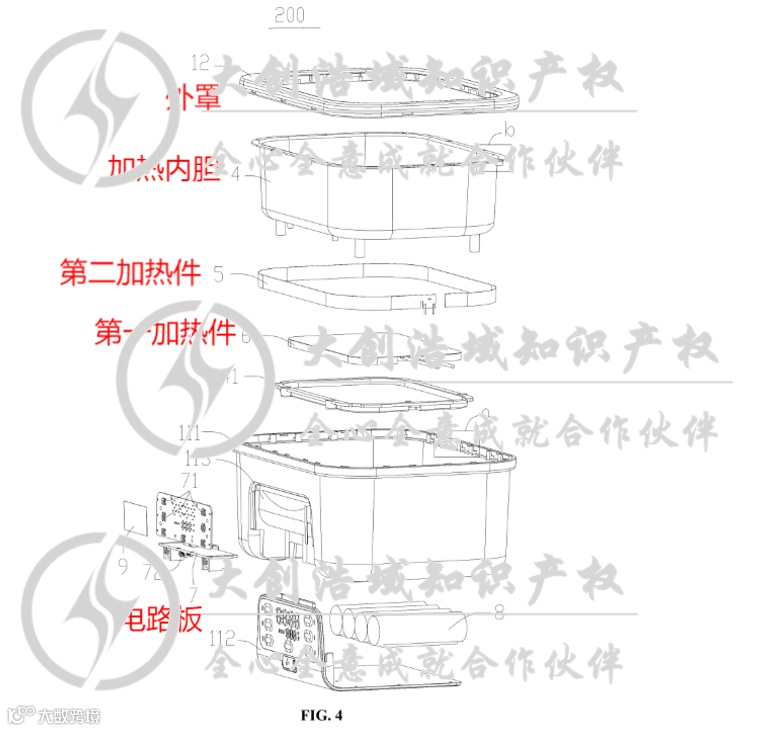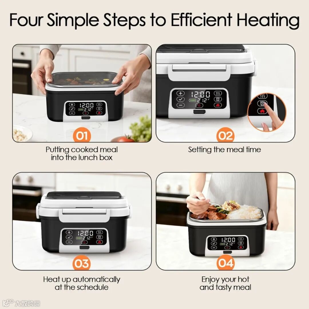 经检索,该产品在美国已获发明专利授权,其权利要求1主要内容如下: - 包括底座和用于盛装食物的饭盒内胆; - 底座由外壳、电路板、第一加热件、第二加热件及内胆构成,上述部件均设于外壳内部; - 第一加热件位于内胆底部,第二加热件设置在内胆外侧壁,两者均与电路板电连接; - 内胆设有容纳槽,顶部为敞口设计,且内胆顶部不超过外壳顶面; - 配备第一温度检测单元,与电路板连接,用于监测内胆、第一或第二加热件的温度; - 外壳由外罩和前框组成,前框位于外罩顶部,内胆置于外壳内并处于前框下方; - 内胆包括导热底板、导热围壁及外缘;前框底部设有限位槽,内胆外缘嵌入其中实现固定。
