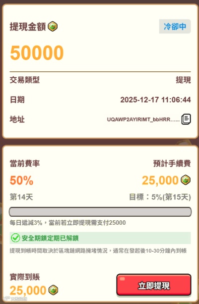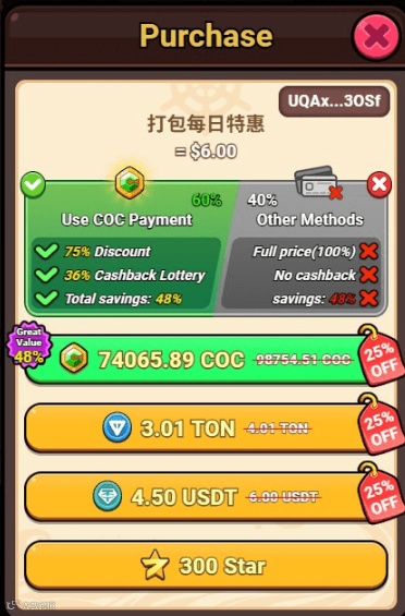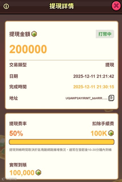 2) COC代币提领:在游戏内点击右上角COC代币进入提现界面,粘贴钱包地址并提交。若选择即时到账,需支付50%手续费,实测到账时间为1~2分钟。