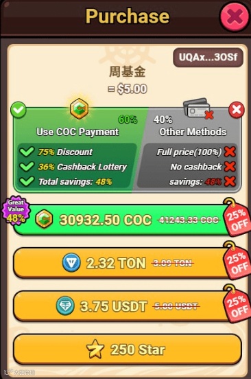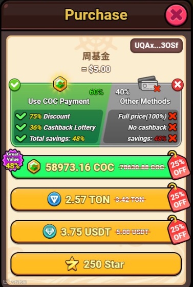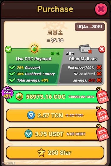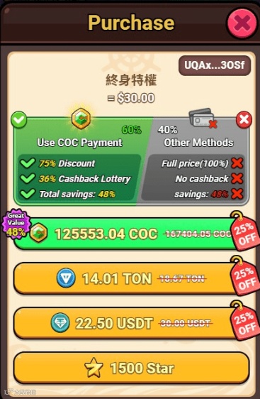 已使用125,553.04 COC购入永久特权卡。未来在未收回此前投入的410U成本前,不再额外自费充值,所有消费均来自游戏收益的COC,其中一半用于再投入,另一半用于出金,持续评估每月现金流表现。