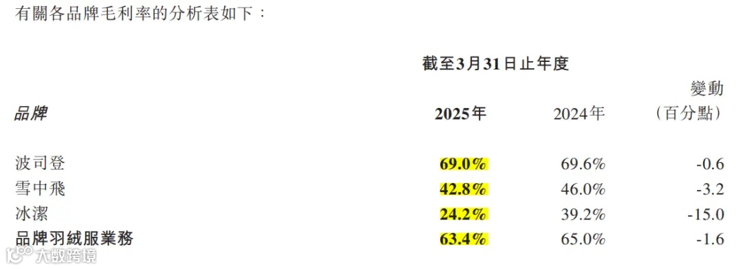 按照收入和毛利率计算(收入×毛利率=毛利),在这一年,品牌羽绒服业务总毛利约137.4亿元,其中波司登主品牌贡献毛利约127.5亿元,占比达92.8%;而雪中飞、冰洁合计贡献毛利仅9.9亿元,占比不足7.2%。换言之,羽绒服业务的毛利几乎由千元档的主品牌支撑,低线品牌的利润贡献微小。