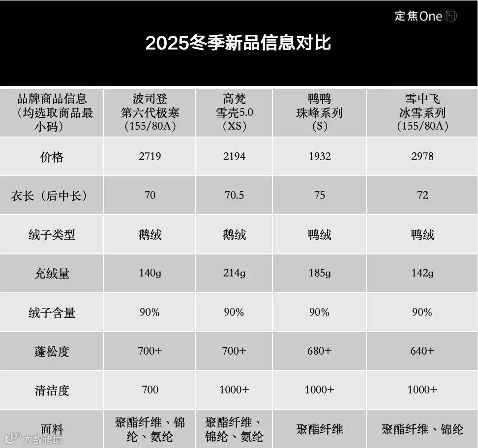 「定焦One」从波司登、高梵、鸭鸭、雪中飞四大品牌的官方店铺中,筛选出衣长、核心性能相近,且价格区间相差不大的2025年冬季新品,对上述核心参数与品质细节进行了对比。