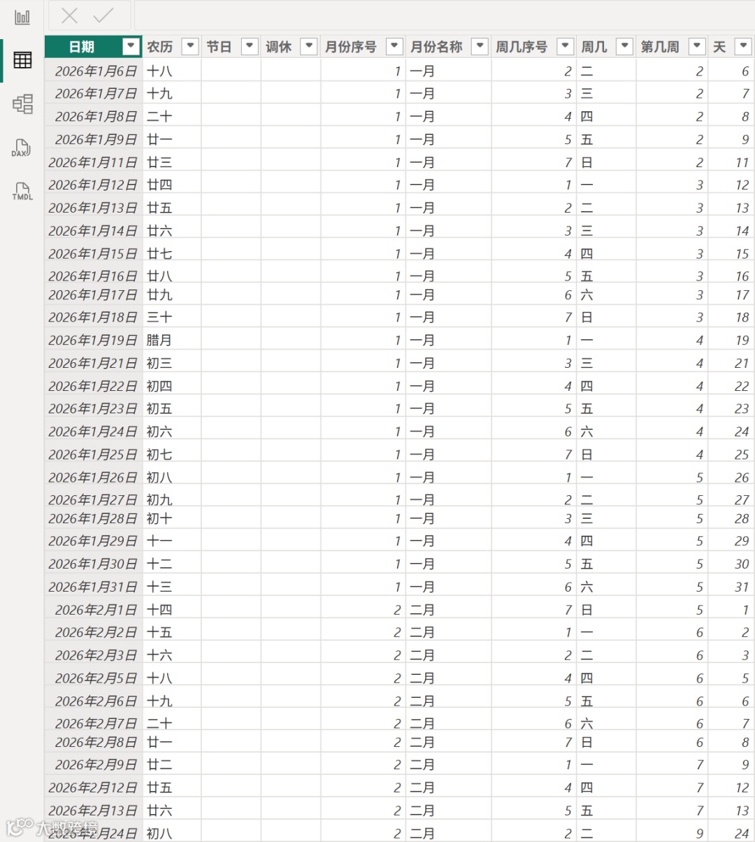 2026 年,新年新气象。为了帮助大家有效管理时间并实现年度目标,一个详尽的 Power BI 日历必不可少。这样的日历不仅能提醒重要日期,还能帮助跟踪项目里程碑和节假日调休,如下。